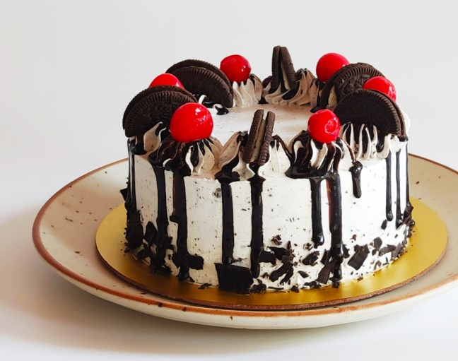 Chocolate cake with crushed oreo cookies, chocolate flakes and cherry sauce with fresh whip cream