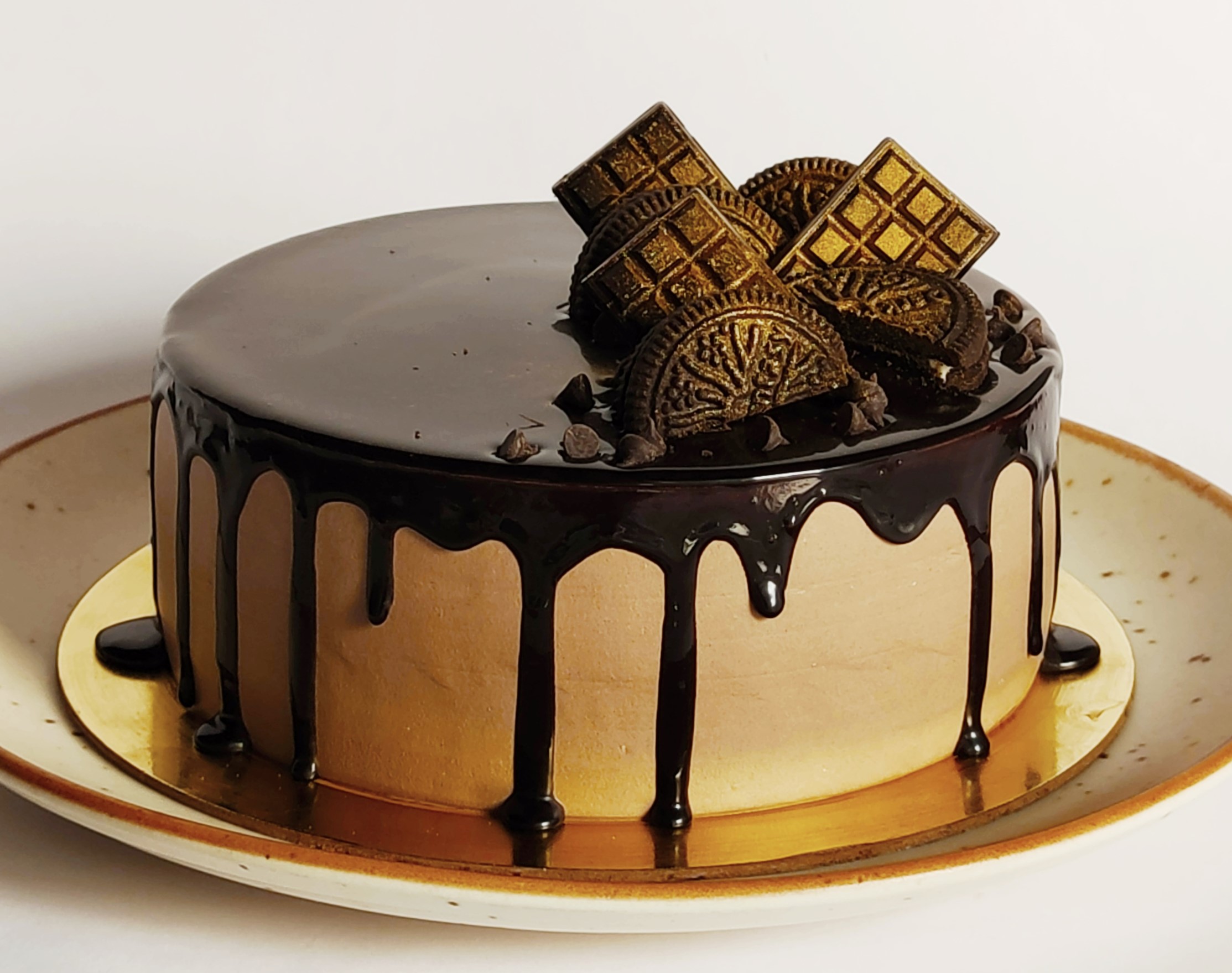 This premium chocolate cake has layers of swiss chocolate mousse with crushed oreo cookies, chocochips, a hint of our house specialty salted caramel and then some more chocolate!