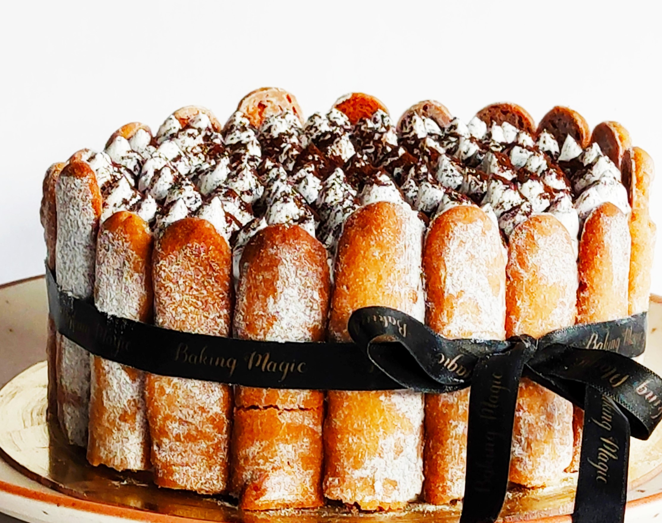 Classic vanilla bean cake soaked in espresso with layers of cream cheese filling and Belgian chocoalte flakes, decorated with lady’s finger butter cookies